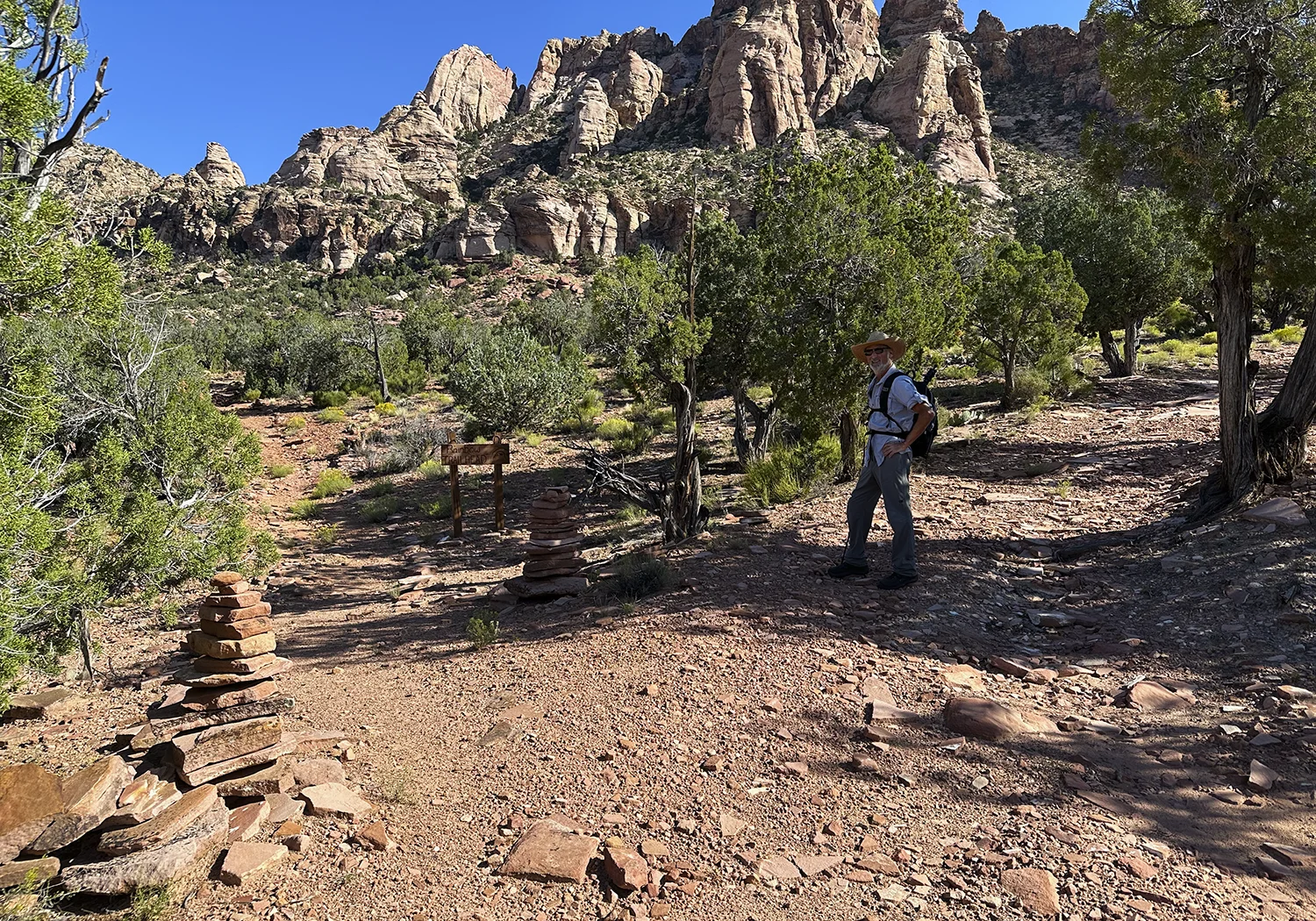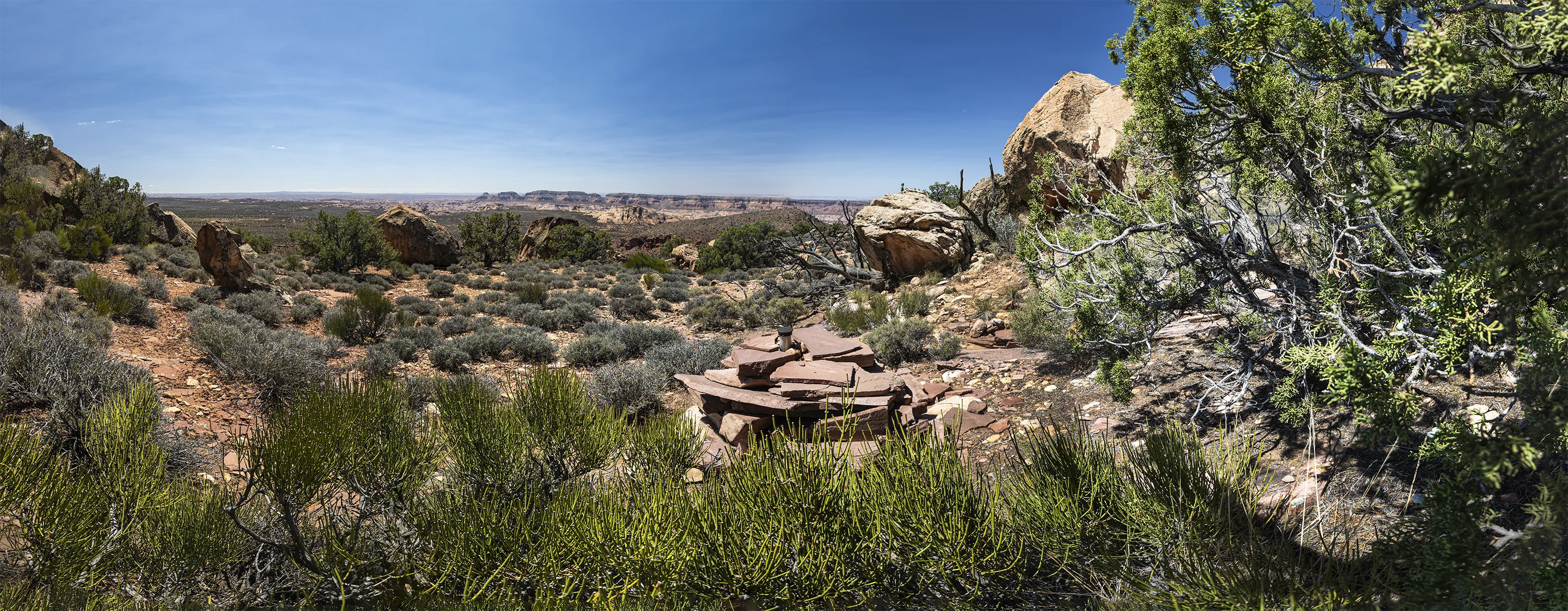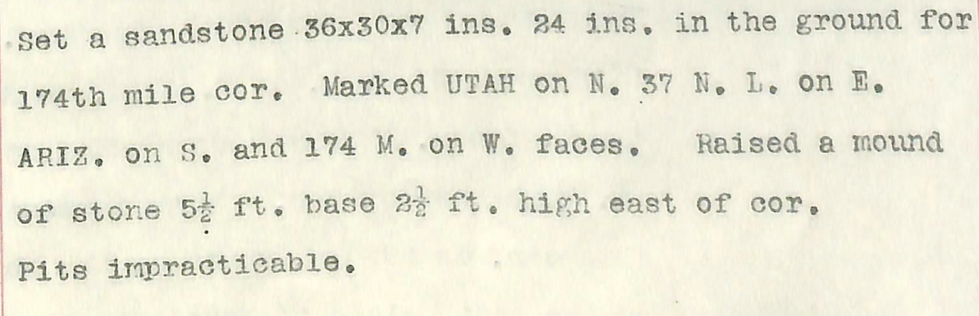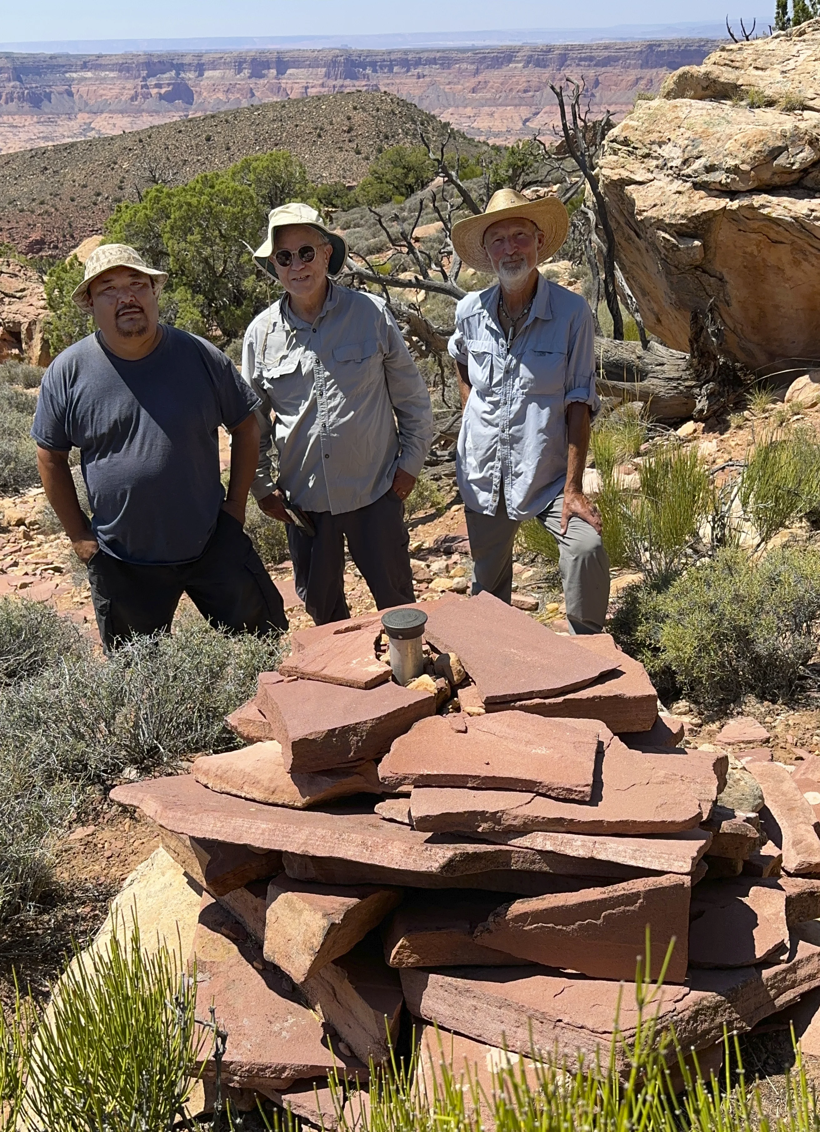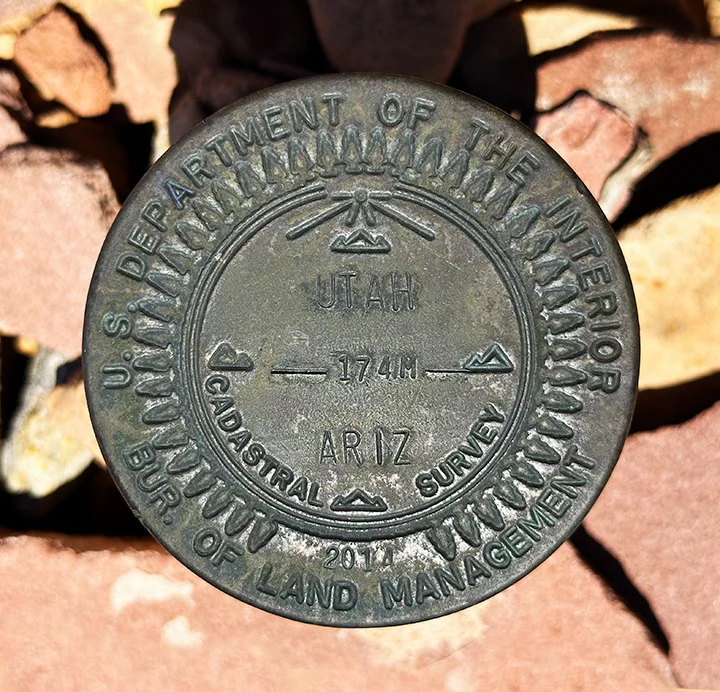 There were no state border markers on the Rainbow Bridge trail; even though he’d roamed this vast landscape since childhood, Lyle hadn’t thought about borders: the physical state boundary has little relevance to members of the Nation. From a close reading of the USGS maps we figured that when we reached an elevation of 6,400 ft. we should head off the trail and hike southeasterly through the high desert, climbing the shoulder of Navajo Mountain to find the survey marker. When the GPS eventually indicated we were in the survey marker’s neighborhood, the three of us prowled around the mesquite and sandstone, finally locating the mound of stone piled around the Mile 174 marker. Howard Carpenter’s survey team had arrived here May 29, 1901 and had placed a sandstone post to mark the corner. In 2014 the marker was updated; we saw no evidence of Carpenter’s original marker.
