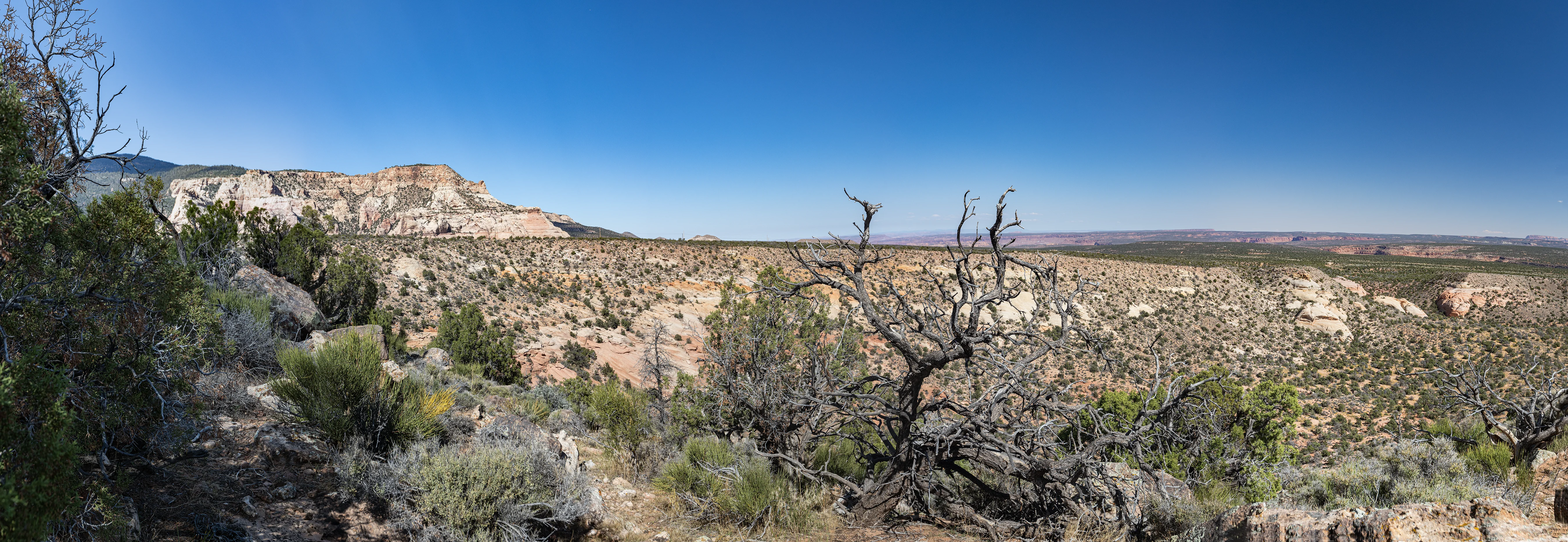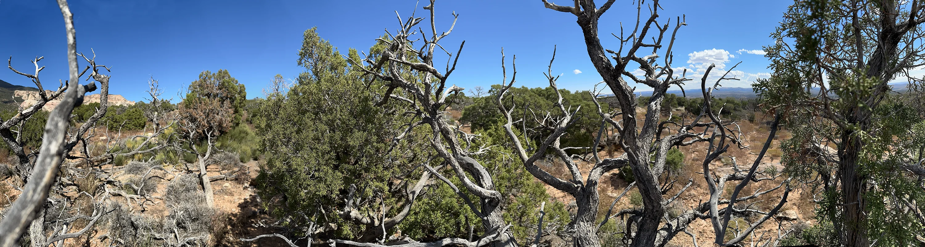 We’re on the southeast shoulder of Navajo Mountain, looking east. Like much of the Navajo Nation, the area is unfenced. Electricity transmission wires are barely visible in the distance– otherwise there’s little hint of human presence. The Southwest suffered a major piñon heat-related die-off in the early aughts.