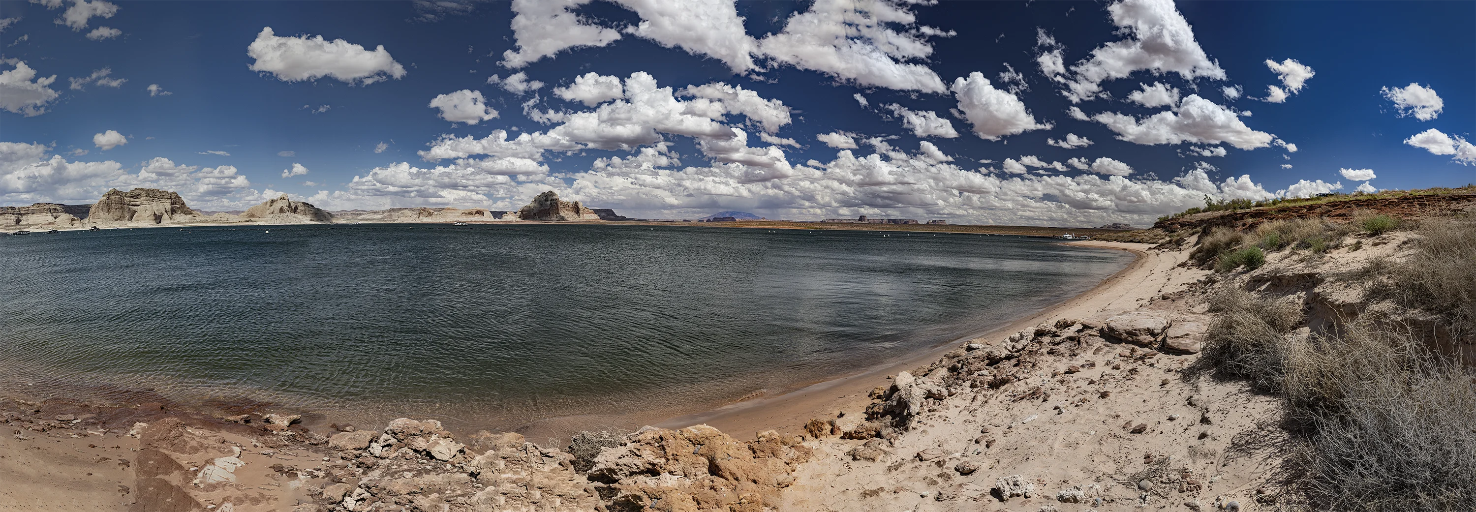 On the edge of Lake Powell, looking east toward the southern shoulder of Navajo Mountain on the horizon.