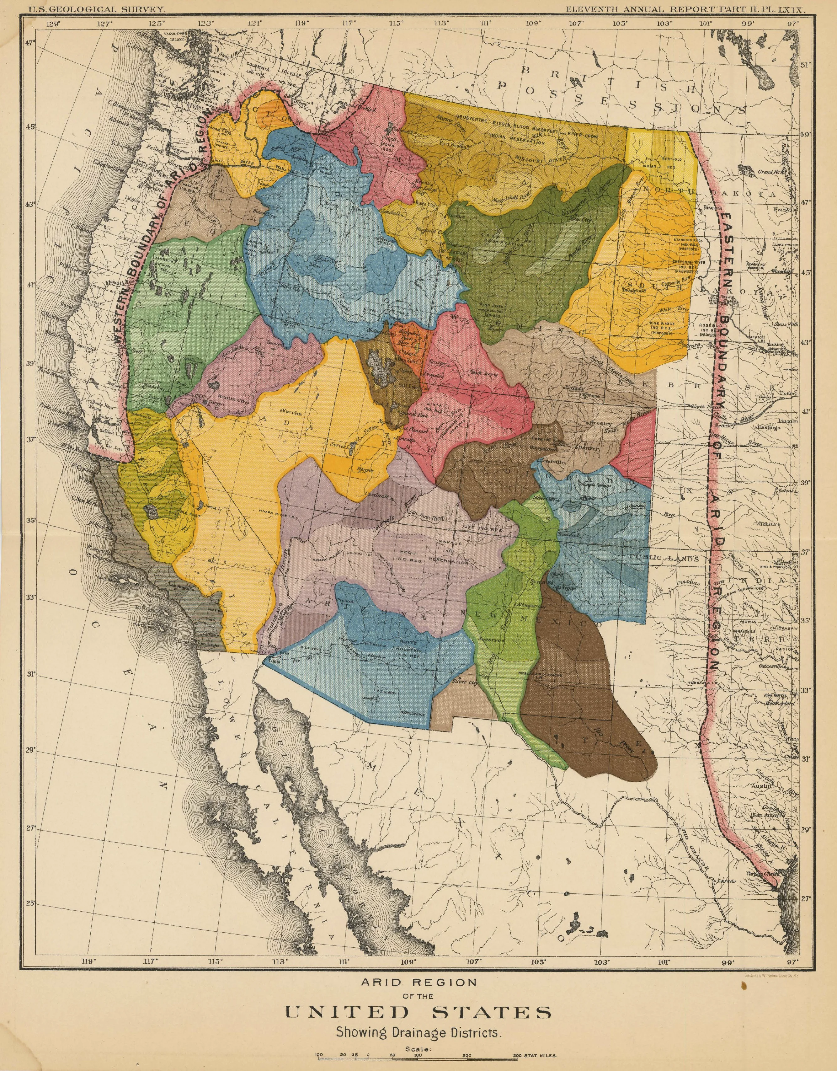 In his remarkable Report on the Lands of the Arid Region of the United States (1878), Powell, anticipating perpetual water wars, argued that political boundaries should be organized by western watersheds. The map below shows how Powell would have carved up the west: