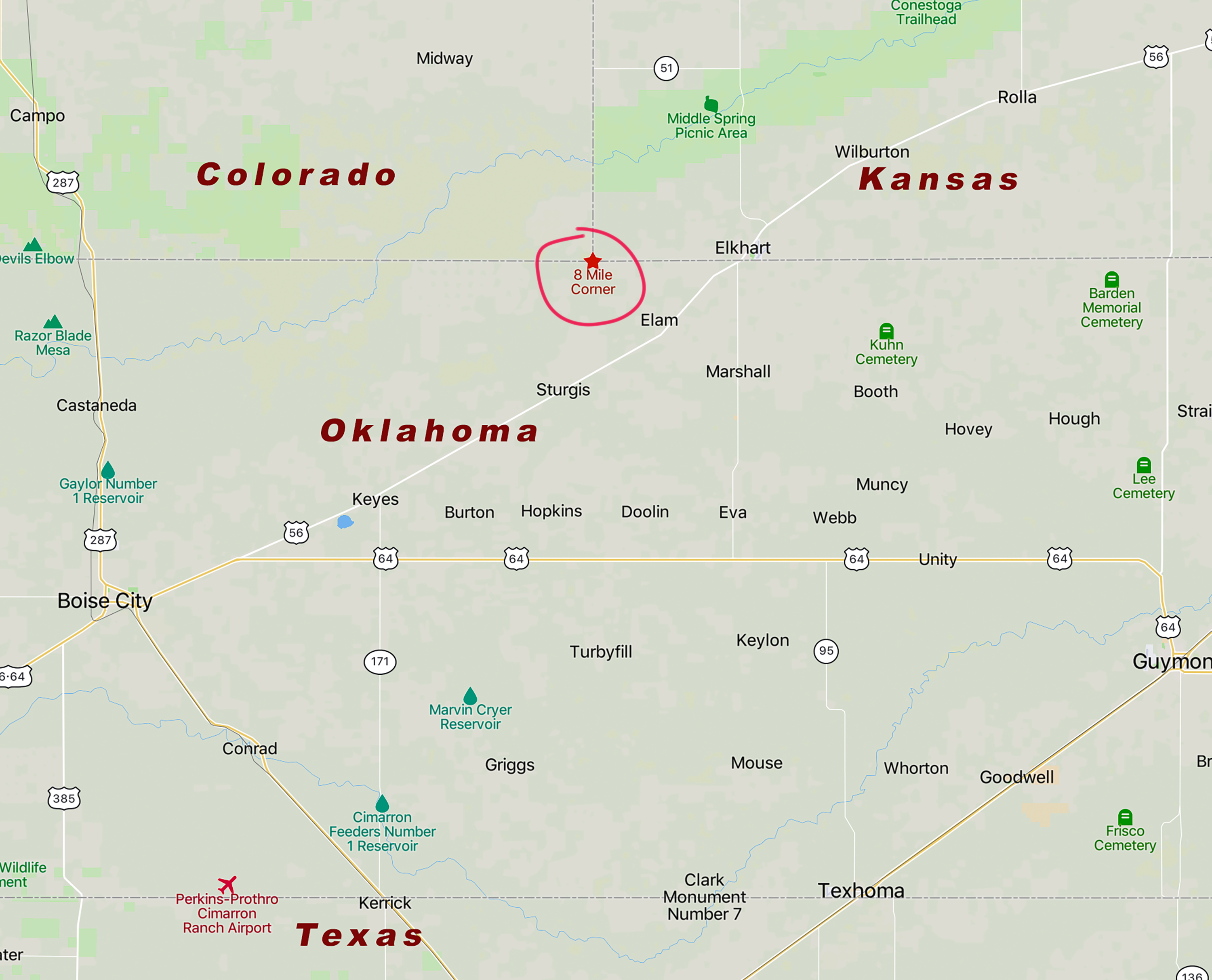 Back to the moment: we’re at Eight Mile Corner in the Cimarron National Grassland. A windpump tower was erected in 1903 with welded flags pointing to the three states. The tower disappeared sometime after September 2016.