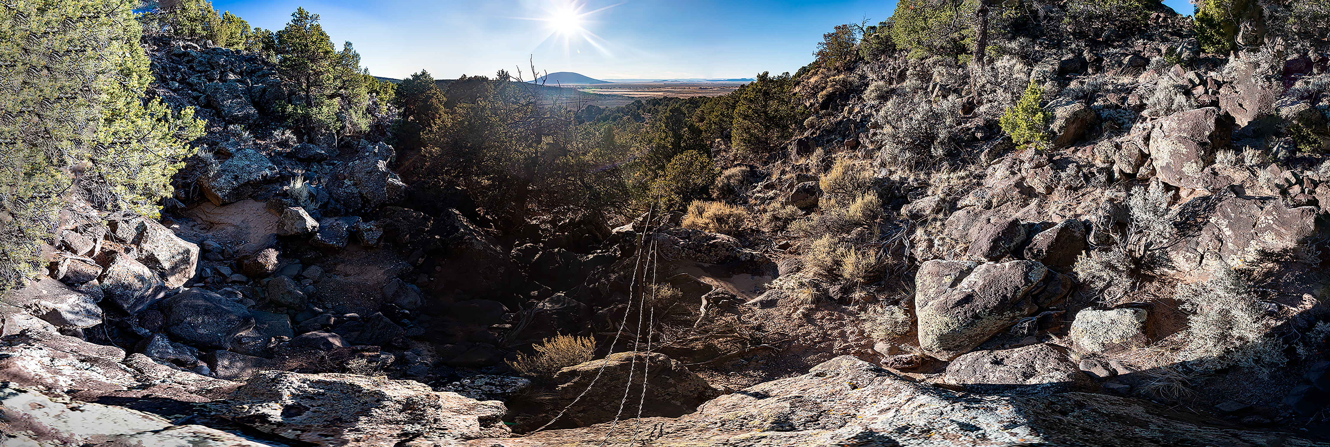 We walk east another mile, crossing a dry irrigation ditch, escaping the sibilance of occasional traffic where NM 522 segues into CO 159 in the high plains windless silence. We clamber up a slope of volcanic boulders, cactus, mesquite, and piñon, unsuccessfully stalking MP 136.