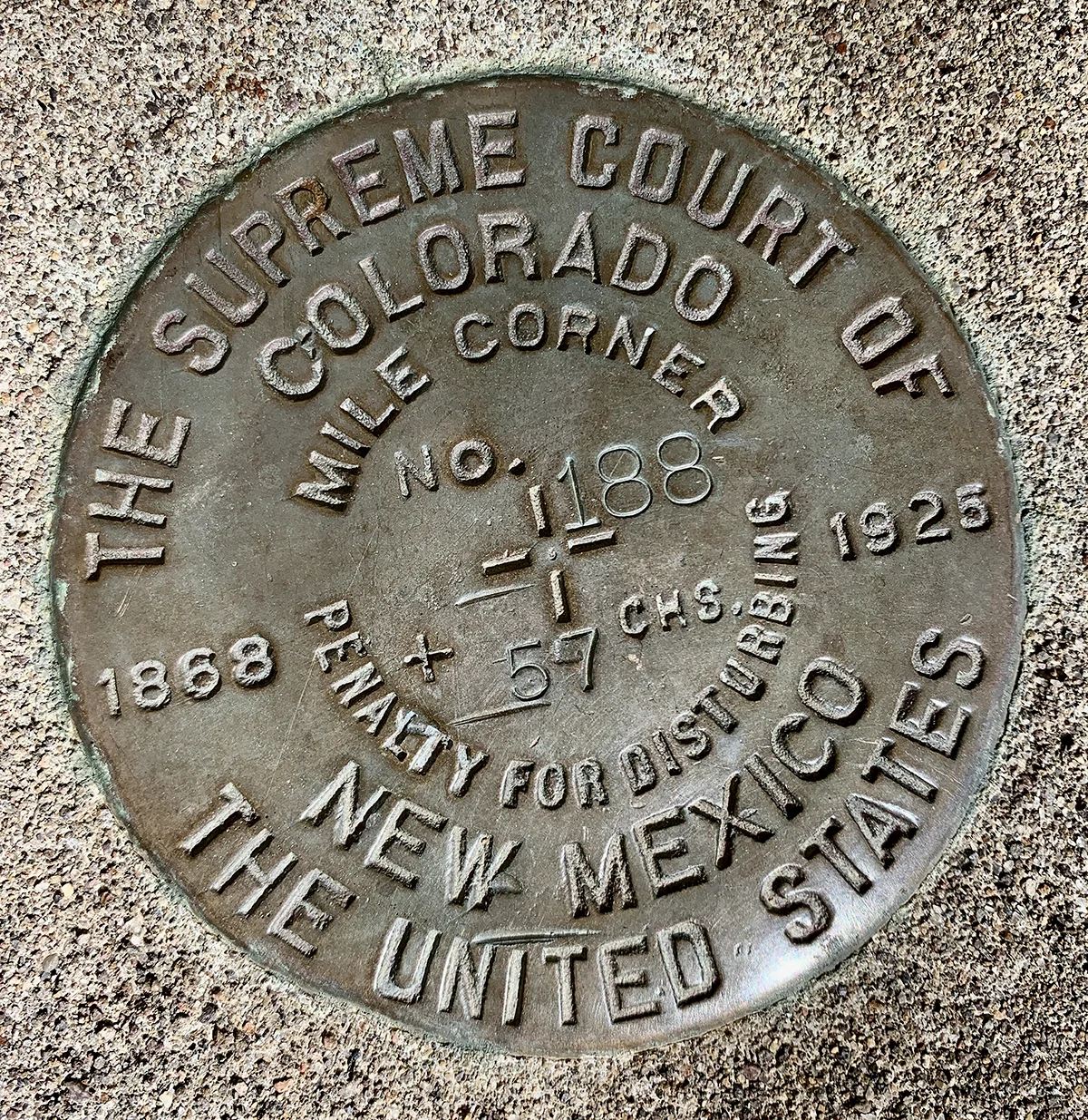 On the Continental Divide National Scenic Trail from Cumbres Pass, we take in grand views of the magnificent Wolf Creek valley. All along our watchtower at 10400 feet we scan for aspens in the foothills, cattle in upland meadows, raptors rising on thermals, abandoned mine tailings of uncertain age, semis creeping toward the pass, and the narrow-gauge steam train chuffing toward Chama, packed with old train buffs, its steam whistle shrieking like a 100-year-old schoolboy in corduroy plus-fours. Sun and shadows slo-mo across the viewscape. On our way south along the trail, we stop at 37 degrees and enjoy the view west at the spot where the border should have crossed, if Ehud Darling had been a more careful astronomer and surveyor back in 1868.