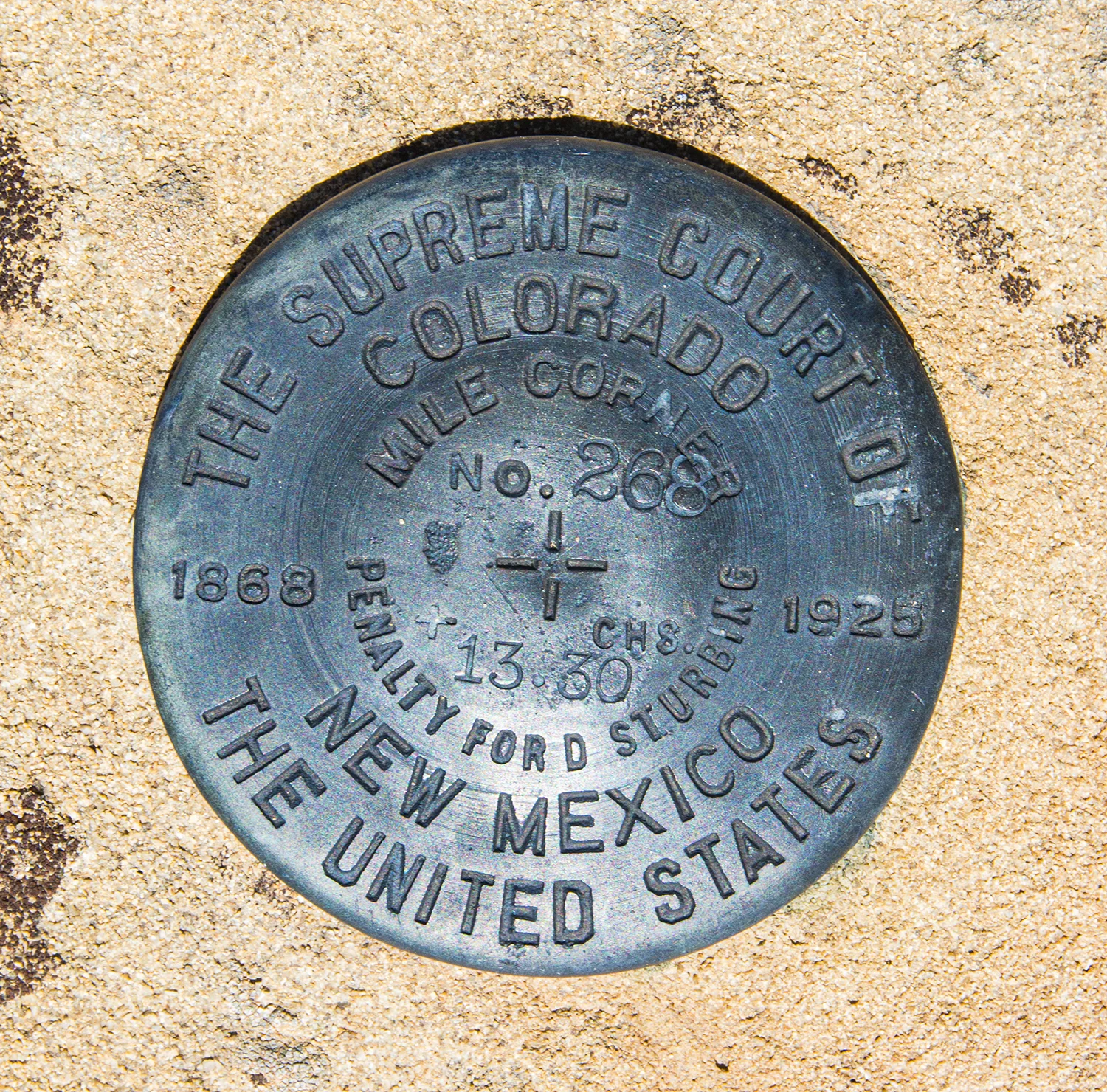 The map showed us that we’d find a monument in the neighborhood of Cox Canyon, north of Aztec Ruins, but it was not precisely clear where we’d find the marker. When the GPS told us we’d crossed into Colorado, we drove up the first driveway and walked toward barking guard dogs who prompted the homeowner to emerge, joint compound trowel in hand, interrupted from a renovation project. We exchanged introductions. Pat Rhodes turned out to be connected to the land through a couple of generations and knew his neighborhood. When asked about the border marker on the map, he said he knew just where it was. He jumped in his pickup; we followed him a half mile south on the dusty canyon road. He stopped, got out of his truck and pointed to the top of the canyon wall where two dead tree branches making an X-shaped cross. “You’ll find it there,” he said, confidently, even though he’d never been up to see it for himself.