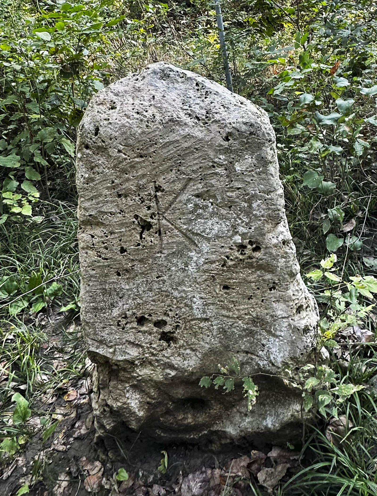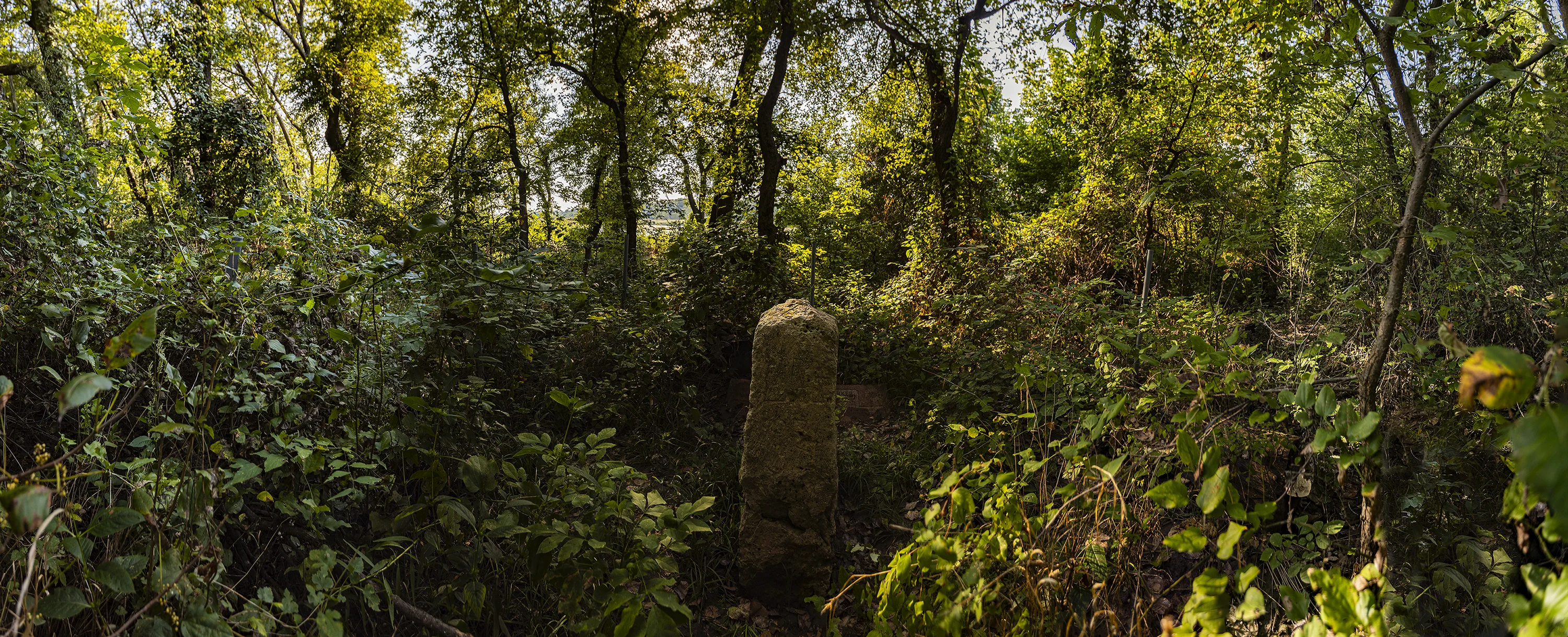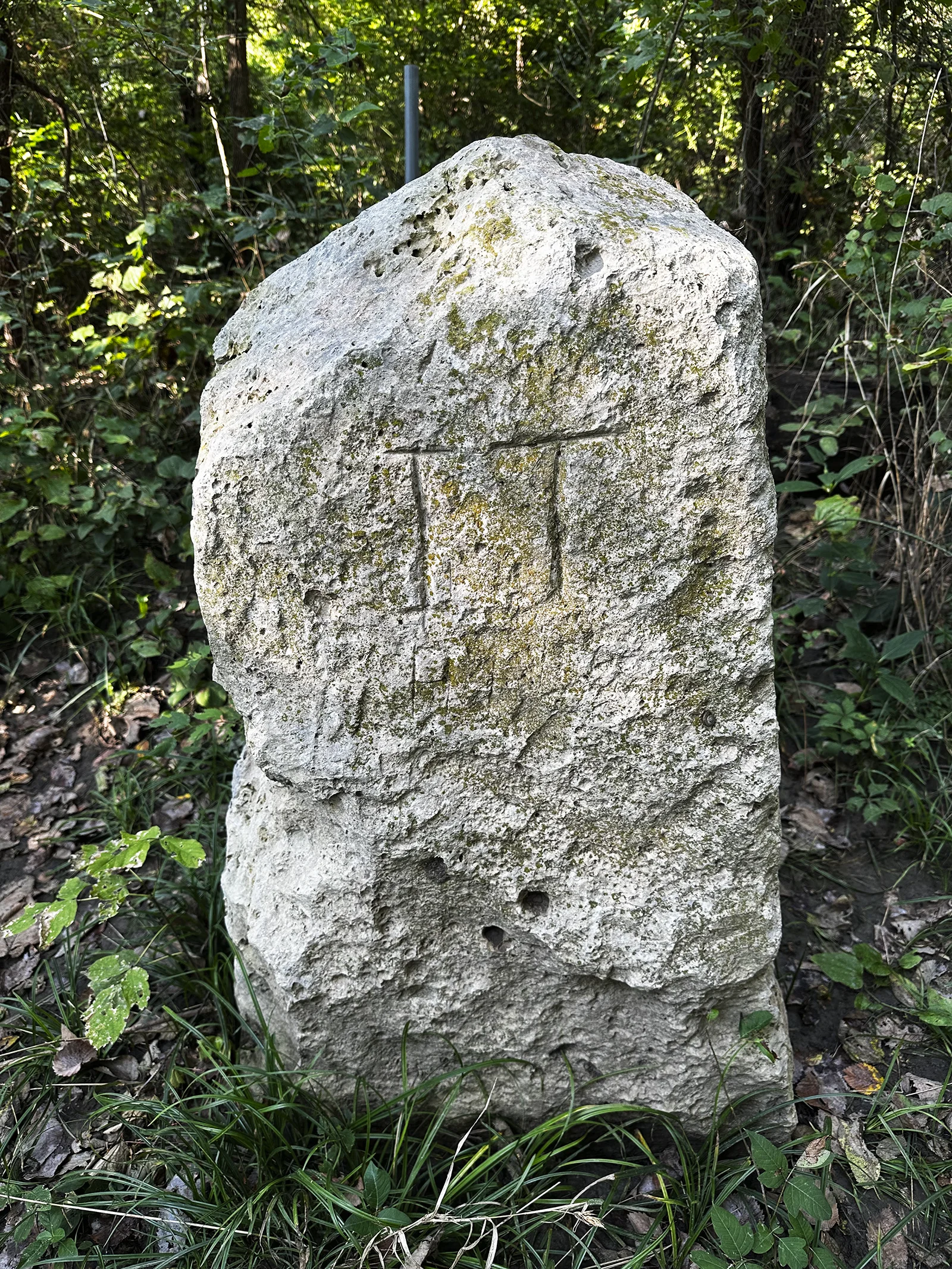 Armed with GPS coordinates, my wife Nancy and I walk precisely west at 37˚ North Latitude toward the Arkansas River, on the northern boundary of the Kaw Nation. We push through the detritus of a vigorous springtime flood to the river’s edge and backtrack, climbing through tangled thorny vines, finally spotting a four foot tall limestone bollard, a standing stone, perhaps.1 There, surrounded by the flood debris and tangled vines, it has the gravitas of an ancient relic, the look of something sacred, lost in an abandoned garden, like a monument to honor a town’s World War II dead in a traffic circle: a cenotaph.