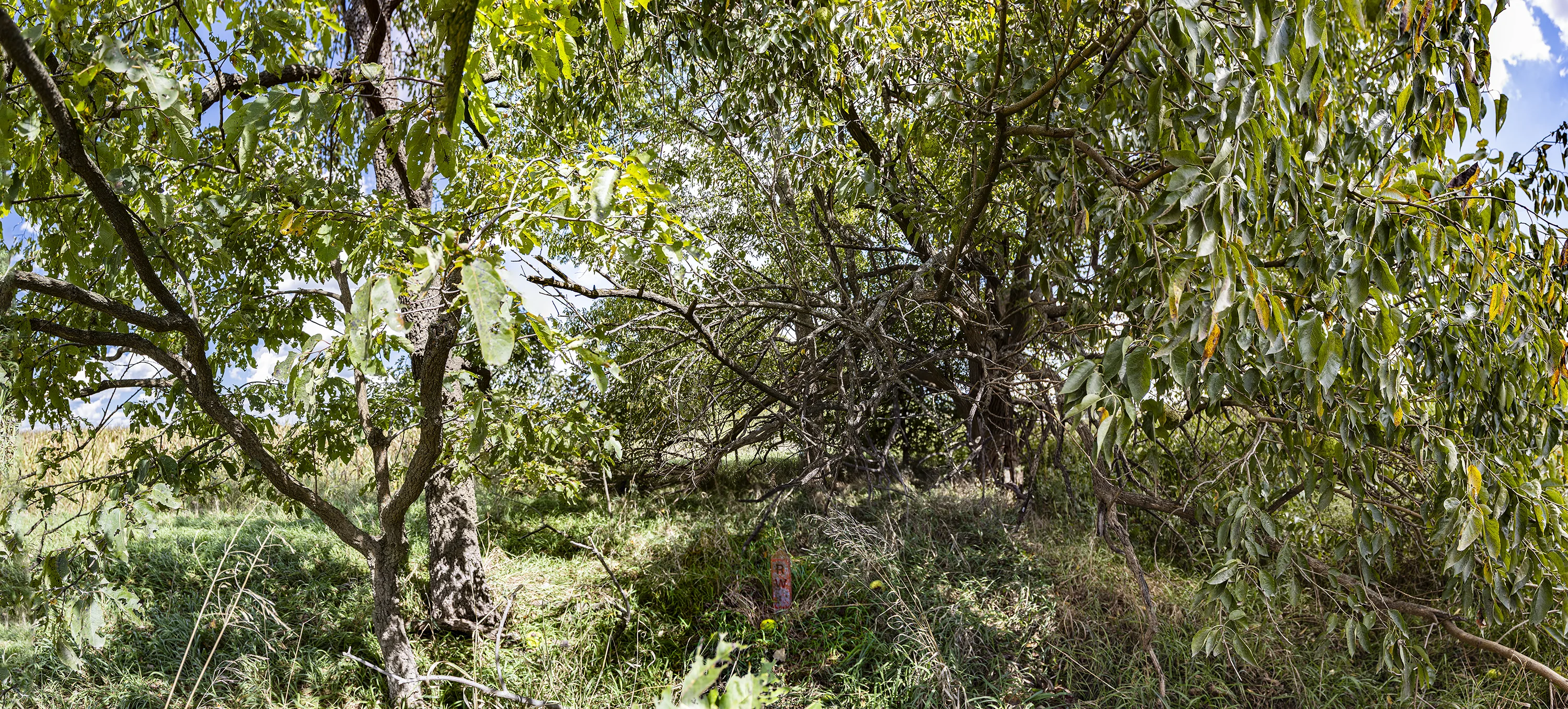 Under a tangled osage orange tree, three miles south of Chetopa, Kansas. Although native to southern Oklahoma and eastern Texas, osage oranges were planted widely throughout the midwest in the 1850s and 60s to fence pastures. An alternative to wooden fences that were expensive and deteriorated quickly, a hedge of closely planted osage oranges was promoted as “horse-high, bull-strong, and pig-tight.” The popularity of osage oranges declined rapidly after 1874 when barbed wire was patented.